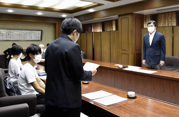 Ryosuke Nanasaki (bên trái) kiến nghị nới lỏng và thay đổi quy định đồng phục trong buổi gặp mặt Thị trưởng phường Edogawa Takeshi Saito. Ảnh: Kyodo. |