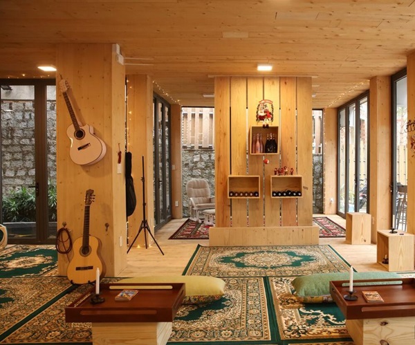 Căn biệt thự gỗ rộng 800 m2 của vợ chồng cựu người mẫu Phan như Thảo được thiết kế sang trọng nhưng cũng vô cùng ấm cúng. Căn biệt thự được xây dựng hoàn toàn bằng khung thép và gỗ, bốn mặt ốp kính; toàn bộ tường, sàn đều được ốp gỗ thông. |