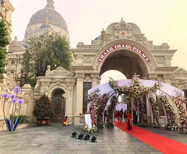 Được biết, chú rể là con trai của vị đại gia Đỗ Văn Tiến - một doanh nhân nổi tiếng ở Ninh Bình trong lĩnh vực sản xuất xi măng. Toà lâu đài này có tên là Thành Thắng - đặt theo tên ghép của 2 người con trai vị đại gia. Khuôn viên công trình rộng khoảng 10.000 m2, toà nhà 6 tầng có diện tích mặt sàn khoảng 2.000m2. |