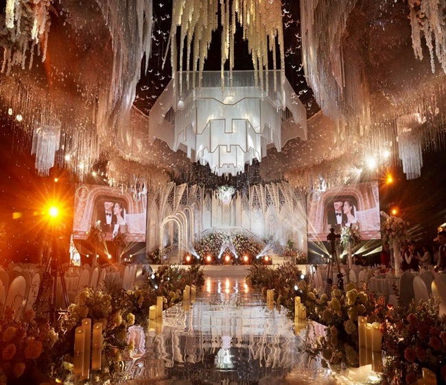 Đám cưới được tổ chức vô cùng hoành tráng với rạp cưới được trang hoàng lộng lẫy. Không gian tiệc cưới với hệ thống đèn chiếu sáng lộng lẫy, huyền ảo khiến cho đám cưới giống với hình ảnh cung điện nguy nga trong truyện cổ tích khiến ai nhìn vào cũng phải choáng ngợp. |