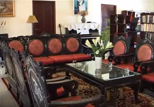 Ngoài điểm nhấn với tông màu đỏ, ngôi nhà của nữ ca sĩ còn gây ấn tượng với những bộ bàn ghế được chạm khắc hoa văn khảm trai tinh xảo. Lý giải về những bộ bàn ghế cổ này, Mỹ Lệ cho biết ông xã là người Huế, thích đồ gỗ mang cảm giác hoài cổ nên những đồ dùng trong nhà đều mang cảm giác xưa cũ.