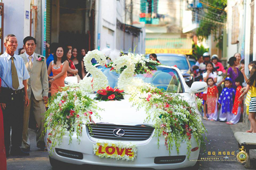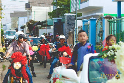 Xe đưa dâu cũng là một chiếc ô tô mui trần sang trọng, đi cùng còn có một đoàn xe phân khối lớn được kết hoa đỏ rất hoành tráng. |