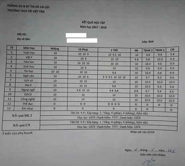 Trước đó, vào cuối năm học 2017-2018, em Tr.T.N.T., nữ sinh Trường THCS Võ Việt Tân (Cai Lậy, Tiền Giang) cũng gây "sóng" cộng đồng mạng vì bảng điểm "thật mà như bịa".