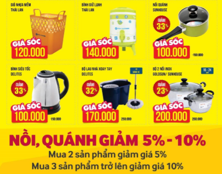 | Nhiều sản phẩm gia dụng đang được bán với giá sốc tại Điện máy Xanh. Riêng nồi, quánh đang được giảm giá từ 5-10% khi mua từ 2 đến 3 sản phẩm trở lên. |
