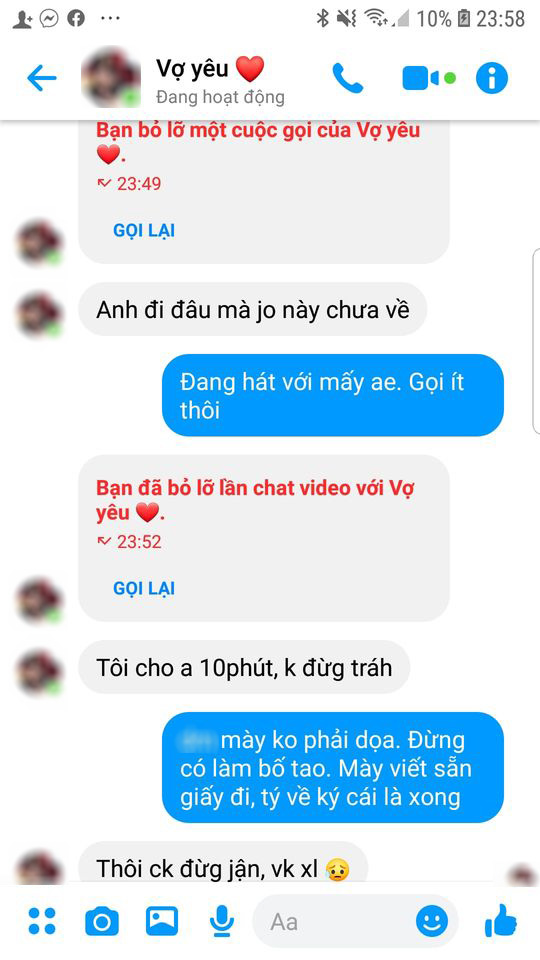 Cô vợ cũng không vừa, ngay lập tức ra lệnh: “Tôi cho anh 10 phút, không đừng trách”. Lúc đó là gần 12h đêm, có lẽ người vợ nào lúc này cũng sẽ thấy lo lắng, nhưng ông chồng lại đang ham vui nên đã đáp trả bằng một câu căng thẳng: “Mày không phải dọa. Đừng có làm bố tao, mày viết sẵn giấy đi, tí về kí cái là xong!”