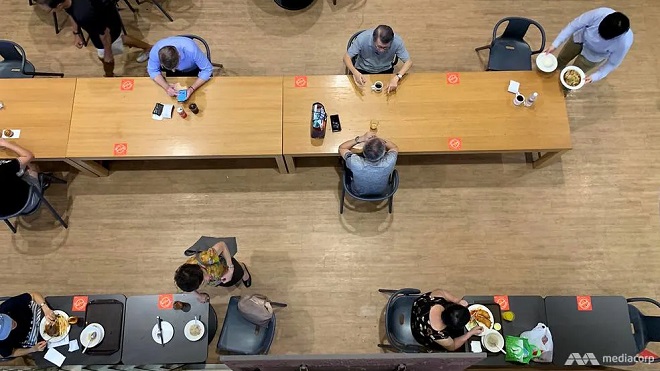 Các khách hàng tại khu ẩm thực tại Trung tâm Công viên Nhân dân ngồi tách biệt. Nhà chức trách cho biết bạn bè và gia đình có thể ngồi cùng nhau trong các nhóm dưới 10, nhưng được khuyên nên giữ khoảng cách với các nhóm khác. Ảnh: Channelnews Asia |