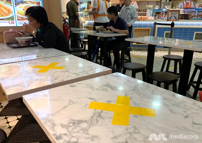 Đánh dấu đỏ khoảng cách an toàn tại một nhà hàng ở khu phố Tàu ở Singapore vào ngày 26/3. Ảnh: Channelnews Asia |