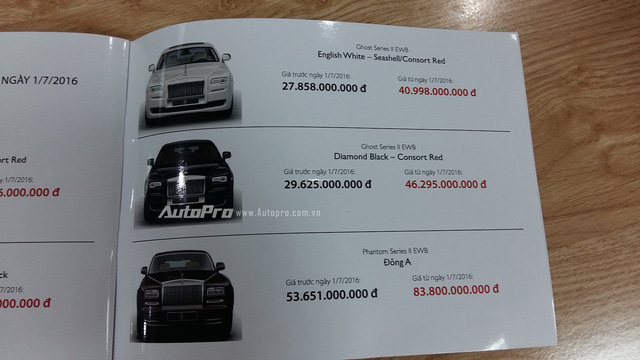 M?i ?�y, nh?ng h�nh ?nh r� r? tr�n m?ng x� h?i ?� h� l? m?c gi� b�n thay ??i tr??c v� sau ng�y 1/7/2016 c?a nh?ng m?u xe Rolls-Royce t?i Vi?t Nam khi?n nhi?u ng??i ph?i gi?t m�nh. V?i ??c tr?ng l� nh?ng m?u xe h?ng si�u sang, c� gi� b�n h�ng ch?c t? ??ng, l?i s? h?u nh?ng kh?i ??ng c? V12 dung t�ch tr�n 6.000cc ?� khi?n nh?ng m?u xe h?ng sang nh? Ghost, Phantom, c� m?c t?ng gi� l�n t?i h�ng ch?c t? ??ng.