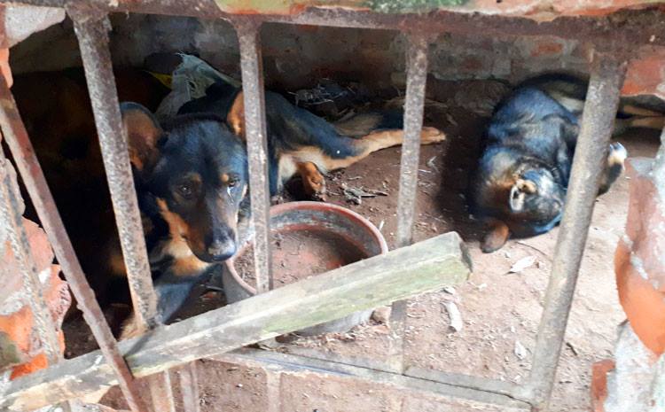 Đàn chó 9 con, trong đó 7 con trưởng thành được nhốt trong cũi của gia đình bà An - Ảnh: VnExpress |
