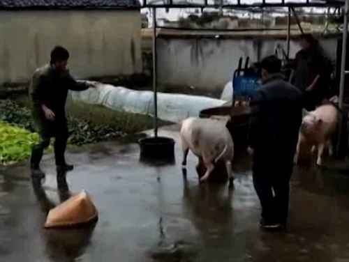 Con lợn xông tới cứu "bạn" đang sắp bị giết thịt. |