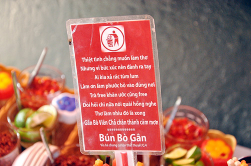 Chủ quán bún bò gân đồng ý không treo bảng ‘nội quy’ tuy nhiên bài thơ “con cóc” nhắc nhở khách giữ vệ sinh và bảng thông báo giờ phục vụ sẽ được giữ nguyên.