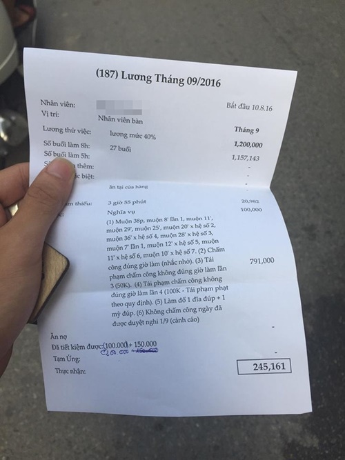 Thứ hai, lí do của chủ quán đưa ra là thường xuyên phải nhắc nhở do ý thức kém không tự chấn chỉnh, nghỉ không phép 01 ngày, đi muộn 10 phút, đi muộn 26 phút, ra ngoài không phép, làm thiếu 1.5h (như ảnh trong bài viết) để trừ lương là vi phạm pháp luật.
