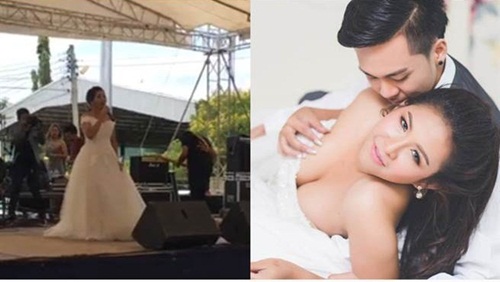 Cô dâu một mình đứng trên sân khấu xin lỗi quan khách trong nước mắt. Ảnh: Coconuts |