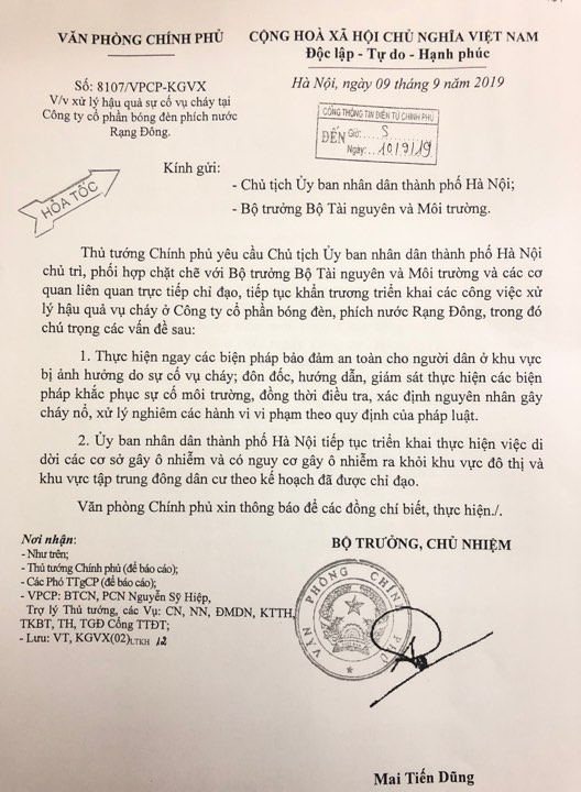 Trước đó, chiều muộn 9/9, Bộ trưởng, Chủ nhiệm văn phòng Chính phủ Mai Tiến Dũng ký văn bản truyền đạt chỉ đạo của Thủ tướng Nguyễn Xuân Phúc về xử lý hậu quả sự cố vụ cháy tại công ty Rạng Đông.