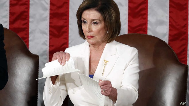 Đêm 4/2, sau khi Tổng thống Donald Trump kết thúc bài phát biểu Thông điệp Liên bang tại khán phòng Hạ viện Mỹ, trong lúc các nghị sĩ đảng Cộng hòa vỗ tay tán thưởng nhà lãnh đạo, Chủ tịch Hạ viện Nancy Pelosi của đảng Dân chủ đã thẳng tay xé đôi bản sao Thông điệp Liên bang.