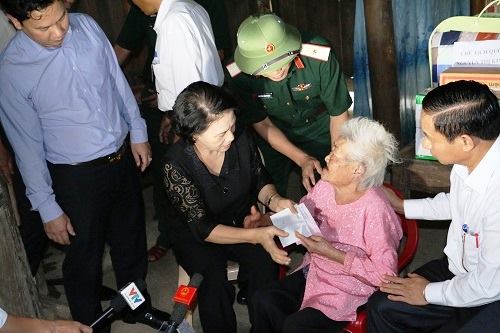 Chủ tịch Quốc hội Nguyễn Thị Kim Ngân thăm hỏi tặng quà cho người dân xã Hòa Hải, huyện Hương Khê (Hà Tĩnh). |