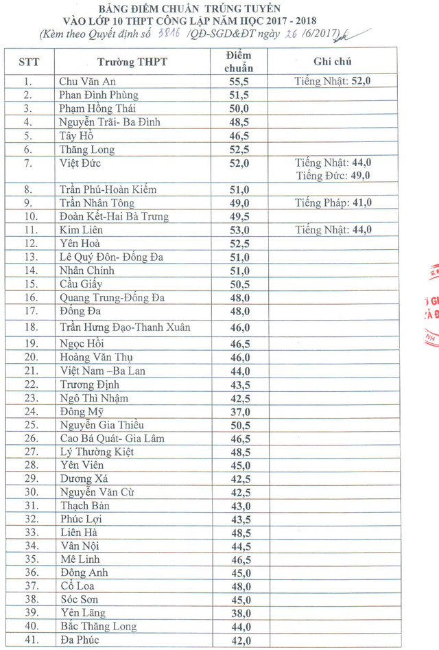 Theo công bố của Sở GD-ĐT Hà Nội, “top” các trường có điểm chuẩn cao, bao gồm: Trường THPT Chu Văn An có điểm chuẩn cao nhất là 55,5 điểm; trường THPT Kim Liên có điểm chuẩn là 53 điểm; trường THPT Thăng Long và THPT Yên Hòa đều có điểm chuẩn là 52,5 điểm; trường THPT Việt Đức là 52 điểm.