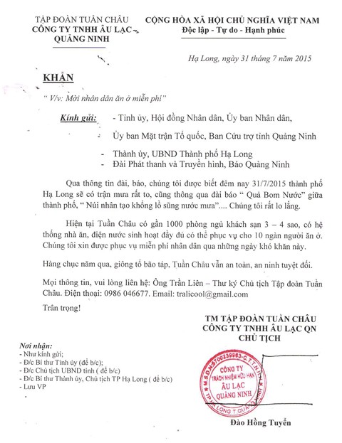 Theo thông báo của lãnh đạo Tập đoàn Tuần Châu, để góp phần chia sẻ những khó khăn với địa phương, tập đoàn này mời nhân dân vùng lụt đến ăn ở miễn phí tại Khu du lịch quốc tế Tuần Châu.