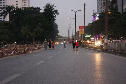 | Phần đường bị chặn trở thành sân chơi cho trẻ em, nơi tập thể dục cho những người dân quanh đây, trái ngược hoàn toàn với sự hỗn loạn của các phương tiện đang tham gia lưu thông ở làn bên. |