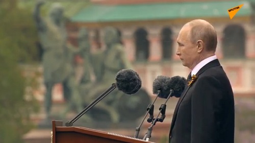 Tổng thống Nga Vladimir Putin tuyên bố một phút mặc niệm, tôn vinh những chiến sĩ vĩ đại đã hi sinh trong cuộc chiến tranh vệ quốc vĩ đại. Ảnh: Sputnik |