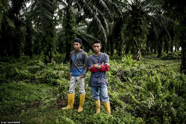 Hai công nhân nhập cư ở Malaysia trong một khu chế xuất dầu cọ ở Sungai Pelek. |