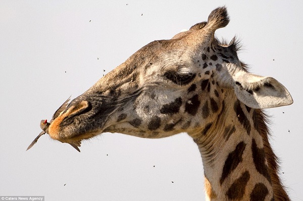 Những người lần đầu quan sát có thể ngạc nhiên khi thấy chú hươu cao cổ dường như ngậm cả thân hình bé nhỏ của đàn chim bắt ve vào miệng.