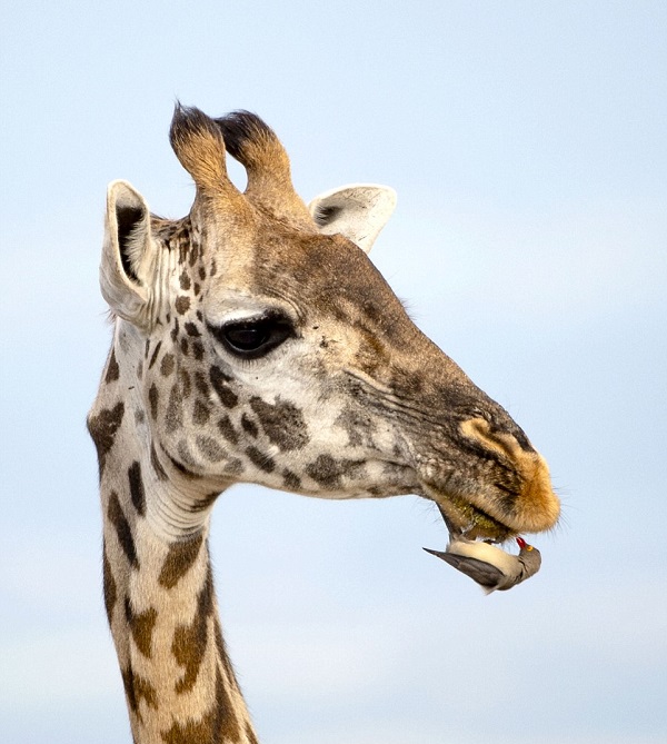 Hươu cao cổ dường như đang ngậm lấy cả chú chim bắt ve bé nhỏ. |