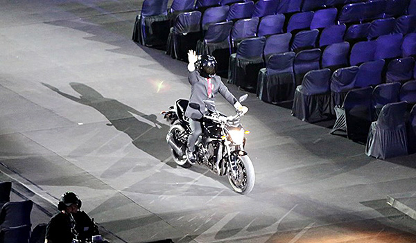BTC Asiad cho phát một đoạn video clip trên màn hình lớn với nhân vật chính đội mũ bảo hiểm kín mặt, phóng xe phân khối lớn trên đường phố Jakarta. Khi chiếc xe đi vào trong sân, nhân vật tháo mũ ra và đó là Tổng thống Indonesia, ông Joko Widodo. Ảnh: SN |