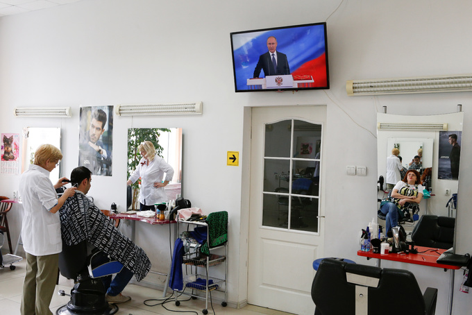 Người dân trong một tiệm làm tóc ở Moskva chăm chú theo dõi Putin tuyên thệ. |