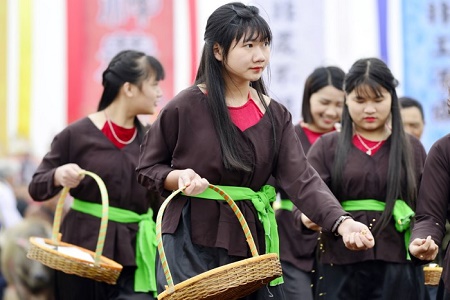 Các thiếu nữ đi sau thả hạt giống xuống những luống cày. |