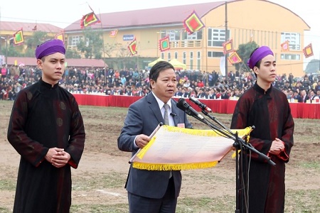Chủ tịch Ủy ban nhân dân tỉnh Hà Nam Nguyễn Xuân Đông đọc văn tế tại lễ hội. |