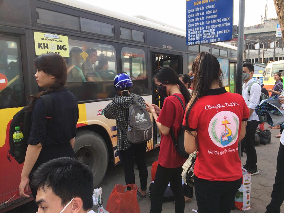 Ở bến xe Giáp Bát, nhiều hành khách mang theo con nhỏ, tay xách nách mang xuống trở lại Thủ đô. Do trời oi bức, cùng với việc di chuyển quãng đường dài khiến nhiều người lộ rõ sự mệt mỏi. Ngay sau đó, một số người dân nhanh chóng bắt xe ôm mang theo hành lí trở về nhà.