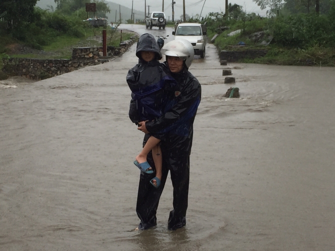 Hai cha con bồng bế nhau trong cơn mưa lũ. (Ảnh Hữu Phương) |