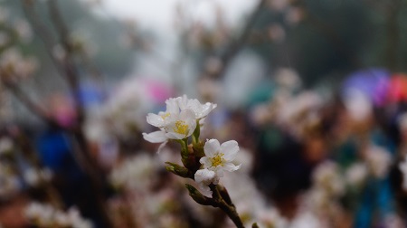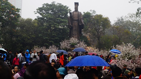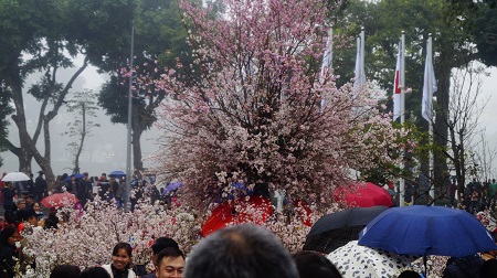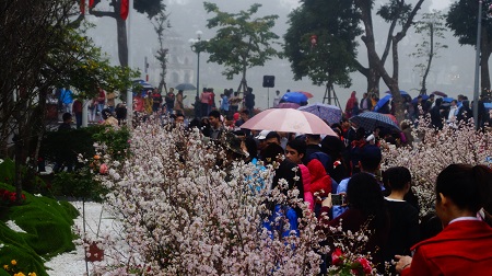 | Dù trời trời mưa phùn nhưng lễ hội hoa anh đào sau tượng đài Lý Thái Tổ vẫn thu hút được nhiều người xem. |