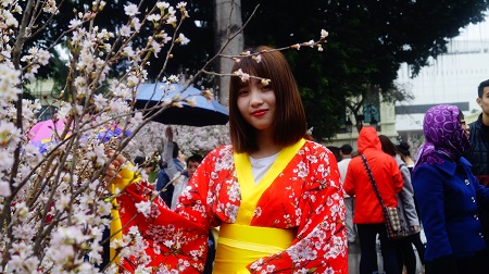 | Nổi bật lễ hội hoa anh đào năm nay là hình ảnh thiếu nữ hóa trang với bộ ki-mô-nô Nhật Bản “đọ sắc” với hoa anh đào dưới thời tiết mưa lạnh |