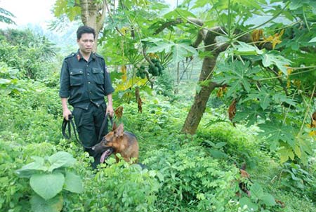Lực lượng công an sử dụng chó nghiệp vụ để tìm dấu vết nghi phạm Đặng Văn Hùng. - ẢNh ANTĐ |