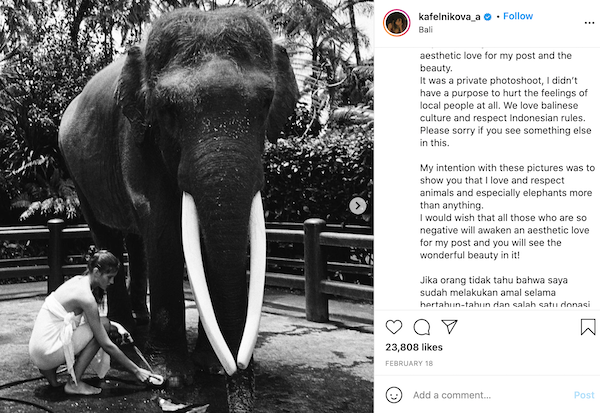 Cô viết: "Tôi rất tiếc vì mọi người coi đây là một sự thô tục nhiều hơn là tình yêu với thiên nhiên. Tôi yêu động vật, tôi yêu voi. Và tôi cũng rất yêu Bali".