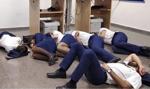 Bức ảnh các thành viên phi hành đoàn Ryanair ngủ trên sàn nhà. Ảnh: Twitter. |