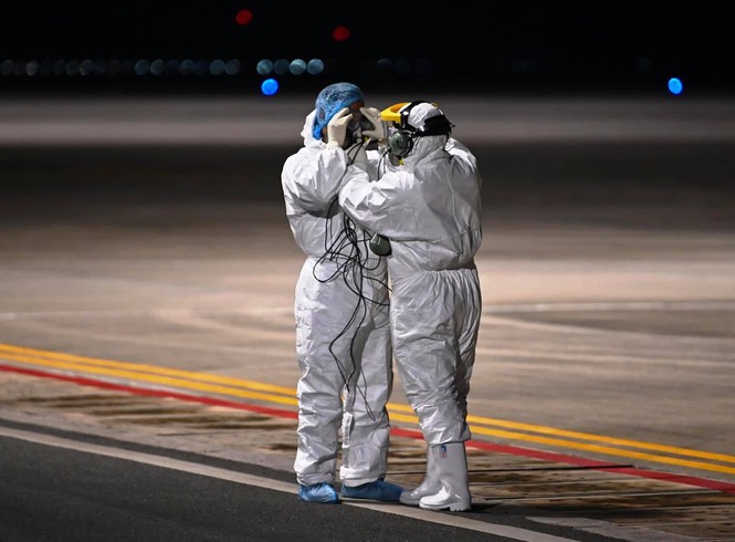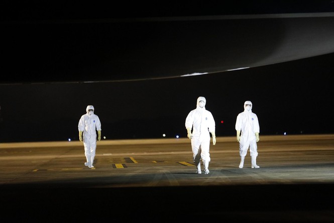 Mới 4h sáng, trời tối đen như mực, khu vực đường băng của sân bay Vân Đồn (Quảng Ninh) vẫn sáng rực đèn. Không giống ngày thường, nhân viên sân bay mặc bộ quần áo bảo hộ trắng kín mít từ đầu tới chân. Nhìn xa giống cảnh những bộ phim viễn tưởng nói đến các phi hành gia bước ra ngoài không gian.