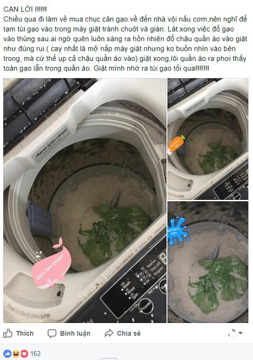 Theo như người này chia sẻ "Chiều qua đi làm về mua chục cân gạo, về đến nhà vội nấu cơm, nên nghĩ để tạm túi gạo vào trong máy giặt tránh chuột và gián. Lát xong việc đổ gạo vào thùng sau, ai ngờ quên luôn".