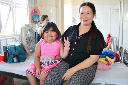 | Nụ cười đáng yêu của bé Trúc Trinh ở bệnh viện. Mắc bệnh xuất huyết giảm tiểu cầu mãn tính nên cơ thể bé Trúc Trinh bị phù, mọc nhiều lông do tác dụng phụ trong quá trình điều trị căn bệnh này gây ra. |