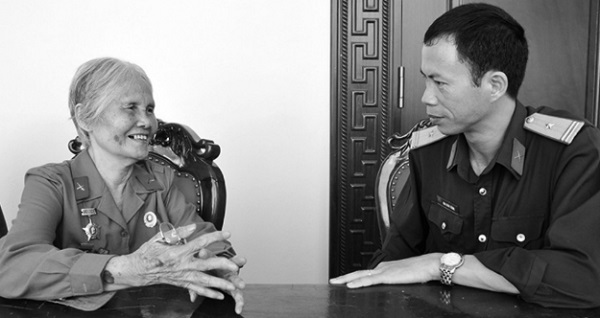 Bà Hoàng Thị Mùi trò chuyện với cán bộ Bộ CHQS tỉnh. |