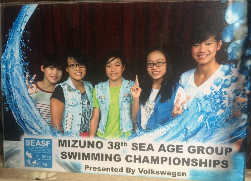 Ngô Thị Ngọc Quỳnh (ngoài cùng bên trái) với các bạn ở Đội tuyển bơi quốc gia |