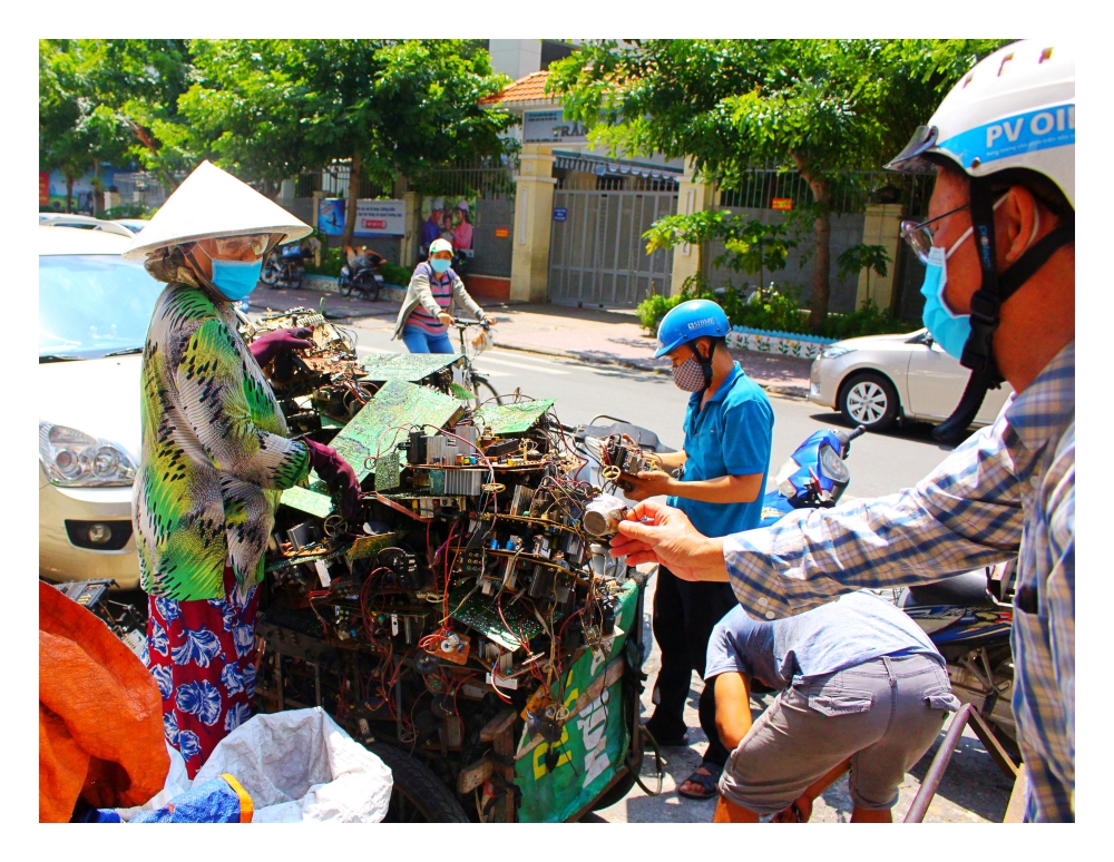 Đúng 10h sáng, bà Cao Thị Thủy, 76 tuổi, ngụ quận 10, TP.HCM lại đẩy chiếc xe chất đầy xác ti vi cũ ra góc đường Vĩnh Viễn - Lý Thường Kiệt (quận 10) bày bán linh kiện điện tử cũ. "Gian hàng" của bà là chiếc xe đẩy cũ kỹ thường thấy của những người thu mua ve chai. Bên trên, bà chất ngổn ngang linh kiện điện tử cũ. Bà cho biết, những linh kiện này được bà rã ra từ công việc "đập" ti vi cũ. Bà đã gắn bó với cái nghề độc đáo bậc nhất TP.HCM này hơn 20 năm qua.