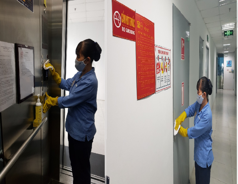 Thực hiện việc lau chùi, khử khuẩn tại các vị trí thường xuyên tiếp xúc trực tiếp như tay nắm cửa khu căn hộ, nút bấm thang máy, hầm để xe hay khu vực không gian hành lang, văn phòng và căn hộ luôn được các nhân viên vệ sinh lau chùi sạch sẽ, phun khử trùng bằng dung dịch CloraminB đều đặn 2 tiếng một lần.