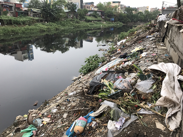 Rác thải tràn ngâp hai bên bờ sông Nhuệ. |