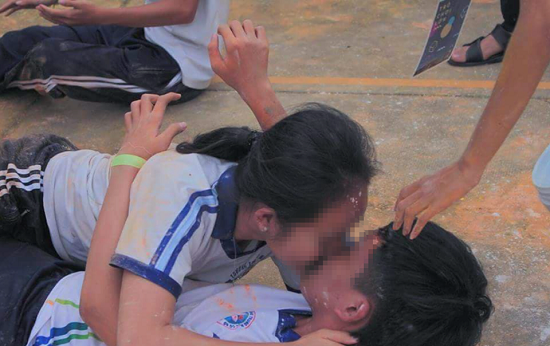 Mới đây, đoạn clip ghi lại hình ảnh học sinh của trường THPT Thực hành sư phạm (ĐH Cần Thơ) đang tham gia một trò chơi, trong đó có nhiều cặp nam nữ nằm chồng lên nhau và lăn lộn trên mặt đất. Các em học sinh không chỉ ôm nhau mà còn dùng miệng truyền cho nhau một chiếc thẻ mỏng giữa tiếng reo hò, cổ vũ của các em học sinh khác.