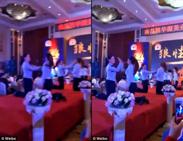 Video clip đăng tải trên mạng xã hội quay lại cảnh bữa tiệc kỉ niệm ngày thành lập một công ty ở Trung Quốc đã khiến cộng đồng mạng dậy sóng. Trên đài chữ T, mười mấy nhân viên nữ quỳ gối đối mặt và liên tục tát vào mặt nhau.