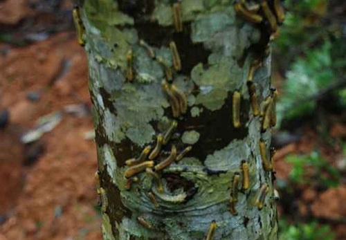 ![]() Sâu bò lổm ngổm trên cây mỡ vàng tâm.Ảnh: ANTT. |