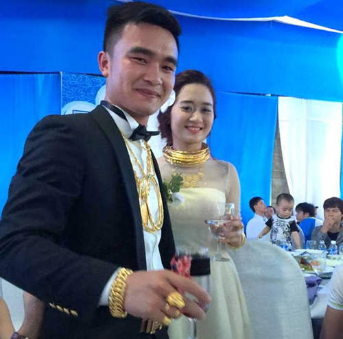 Chú rể Quốc Cường và cô dâu Phương Thúy trong ngày trọng đại. Vàng, bạc là những món quà thể hiện sự may mắn của họ hàng, người thân tặng họ. Ảnh: Nhân vật cung cấp. |